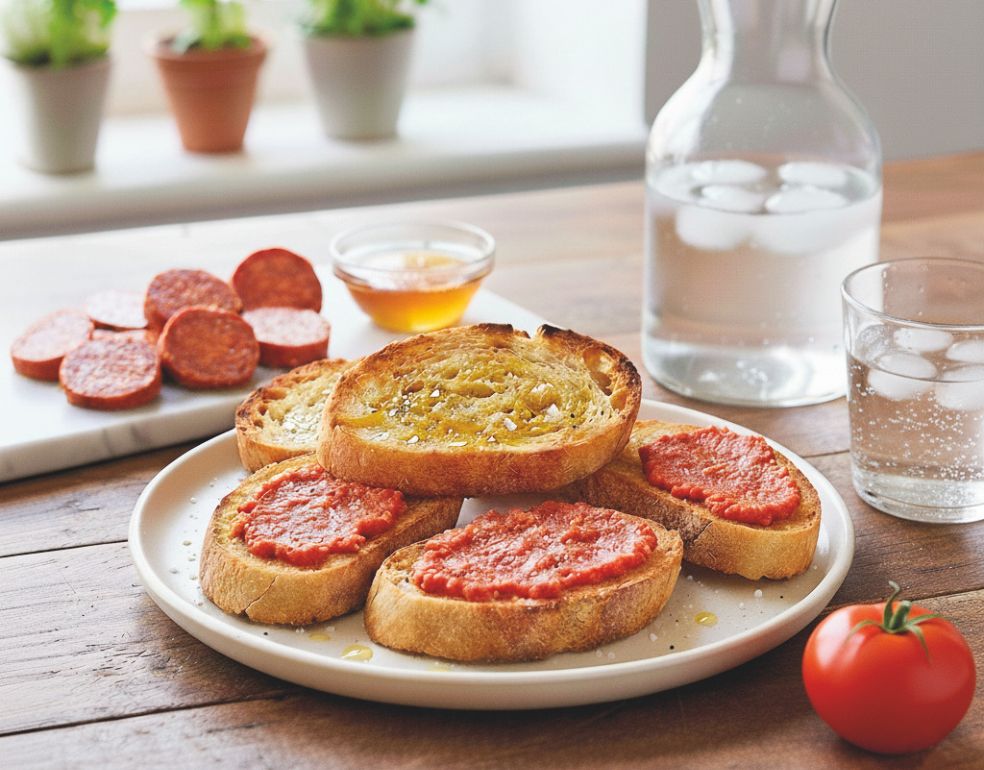 «Pan de pueblo tostado, con ajo, tomate, aceite y sal. A veces le pongo sobrasada mallorquina. Para beber, solo agua; no me gusta el café».
